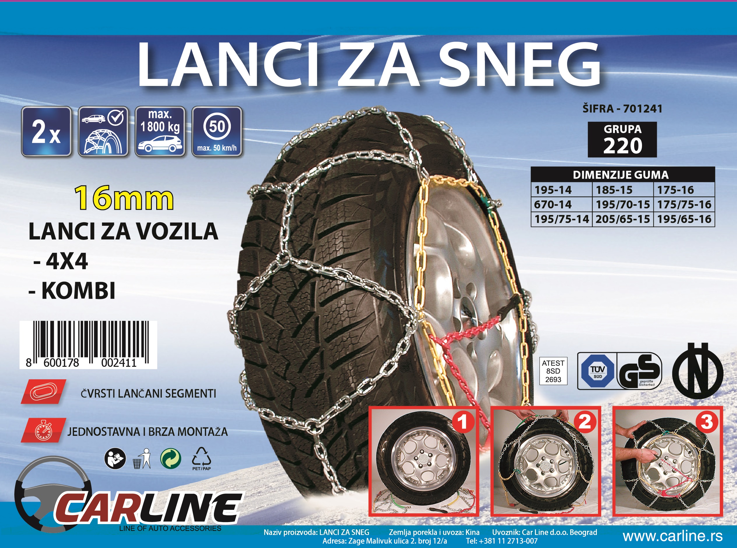 Lanci za sneg 16 mm za SUV i laki dostavni program, grupa 220. TUV/GS sertifikat. Dimenzije guma: 195-14, 670-14, 195/75-14, 185-15, 195/70-15, 205/65-15, 175-16, 175/75-16, 195/65-16