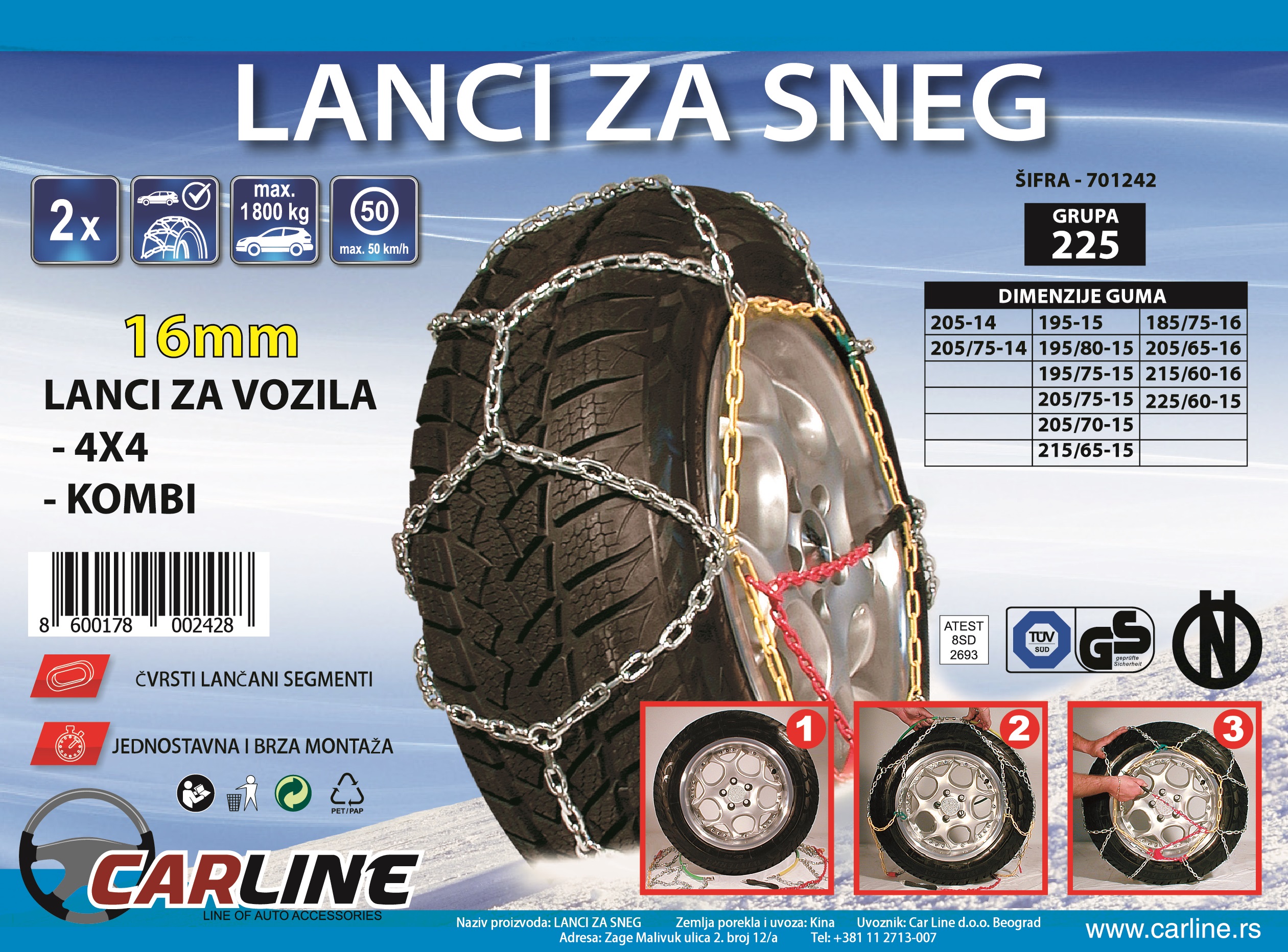 Lanci za sneg 16 mm za SUV i laki dostavni program, grupa 225. TUV/GS sertifikat. Dimenzija guma: 205-14, 205/75-14, 195-15, 195/80-15, 195/75-15, 205/75-15, 205/70-15, 215/65-15, 225/60-15, 185/75-16, 205/65-16, 215/60-16