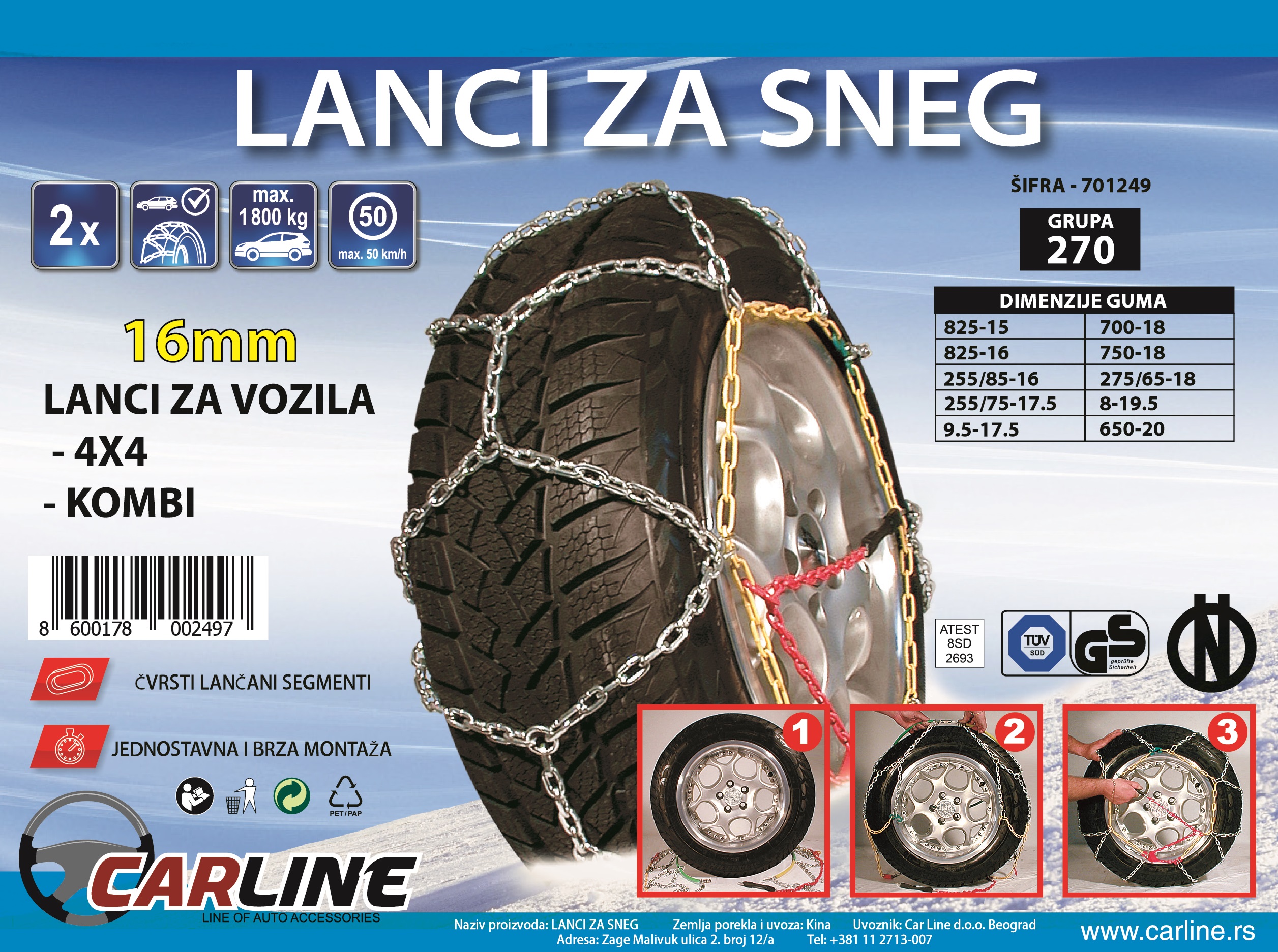 Lanci za sneg 16 mm za SUV i laki dostavni program, grupa 270. TUV/GS sertifikat. Dimenzije guma: 825-15, 825-16, 255/85-16, 275/65-16, 255/75-17.5, 9.5-17.5, 700-18, 750-18, 8-19.5, 650-20
